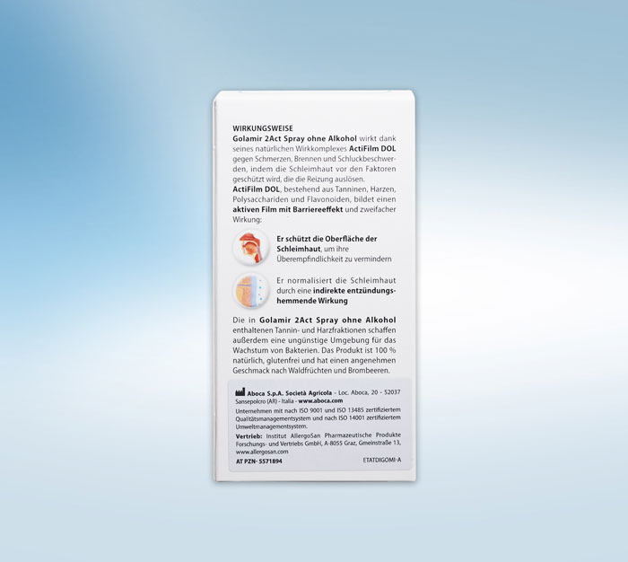 Golamir 2Act Spray ohne Alkohol kann aufgrund seines Wirkungsmechanismus auch in Verbindung mit pharmakologischen, vom Arzt verschriebenen Behandlungen verwendet werden.