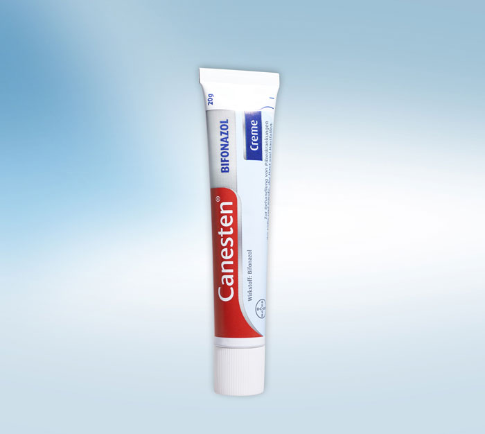 Canesten® Bifonazol Creme enthält den Wirkstoff Bifonazol. Dieses Antimykotikum stört den Aufbau der Pilzzellwand. Es zieht nach Auftragen in die betroffene Stelle ein, hemmt Pilzwachstum und tötet Pilzzellen ab. Die Breitbandwirkung eignet sich gut für Mischinfektionen. Durch die längerfristig anhaltende Wirkung muss dadurch nur 1x am Tag angewendet werden.