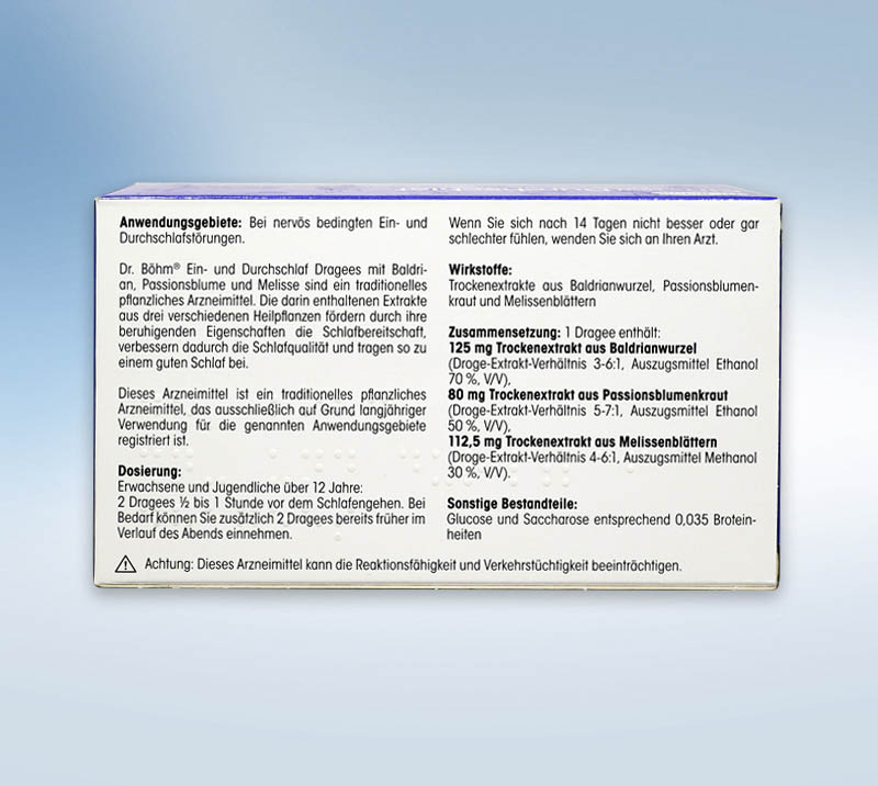 Dr. Böhm® Ein- und Durchschlaf enthält eine hochwirksame 3-fach-Kombination aus drei natürlichen Schlafhelfern: Baldrian, Passionsblume und Melisse. Die drei Wirkstoffe ergänzen sich optimal und verstärken sich gegenseitig in ihrer Wirkung. So wirken die drei natürlichen Mittel gegen Schlafstörungen: