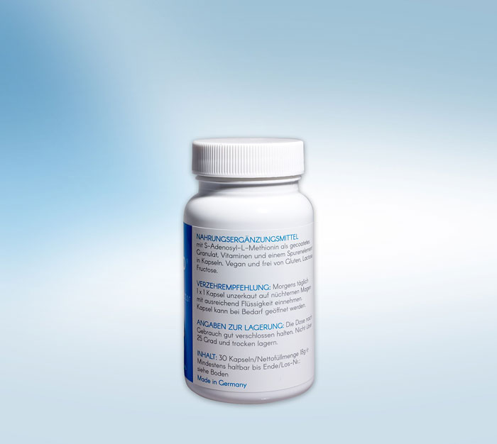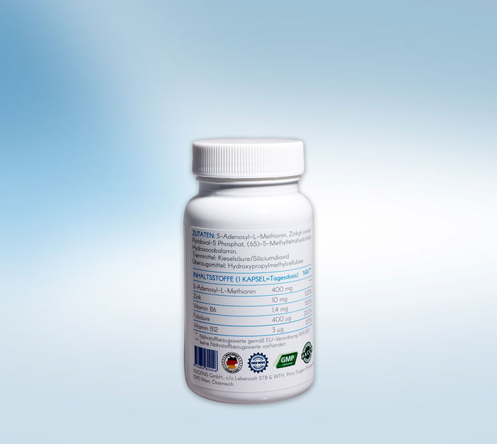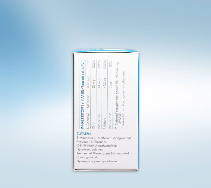 S-Adenosyl-L-Methionin, Zinkgluconat, Pyridoxal-5-Phosphat, Quatrefolic® (6S)-L-5-MTHF als Glucosaminsalz, Hydroxocobalamin, Mais Stärke Bio, Maltodextrin Bio