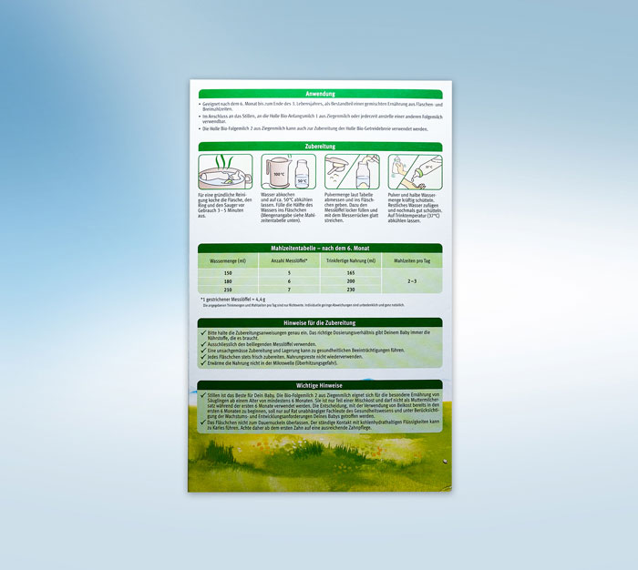 Bitte halten Sie die Zubereitungsanweisungen genau ein. Das richtige Dosierungsverhältnis gibt Ihrem Baby immer die Nährstoffe, die es braucht.