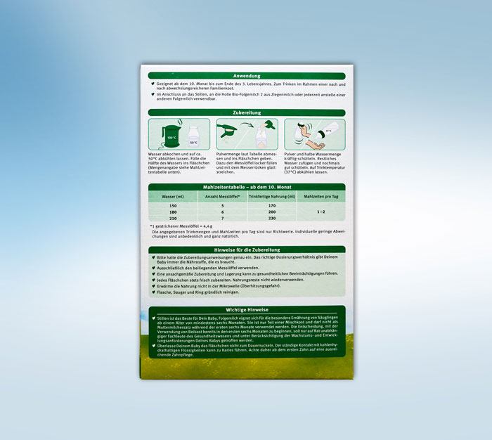 Bitte halten Sie die Zubereitungsanweisungen genau ein. Das richtige Dosierungsverhältnis gibt Ihrem Baby immer die Nährstoffe, die es braucht. Ausschließlich den beiliegenden Messlöffel verwenden. Eine unsachgemäße Zubereitung und Lagerung kann zu gesundheitlichen Beeinträchtigungen führen. Jedes Fläschchen stets frisch zubereiten. Nahrungsreste nicht wiederverwenden. Erwärmen Sie die Nahrung nicht in der Mikrowelle. Überhitzungsgefahr! Flasche, Sauger und Ring gründlich reinigen.