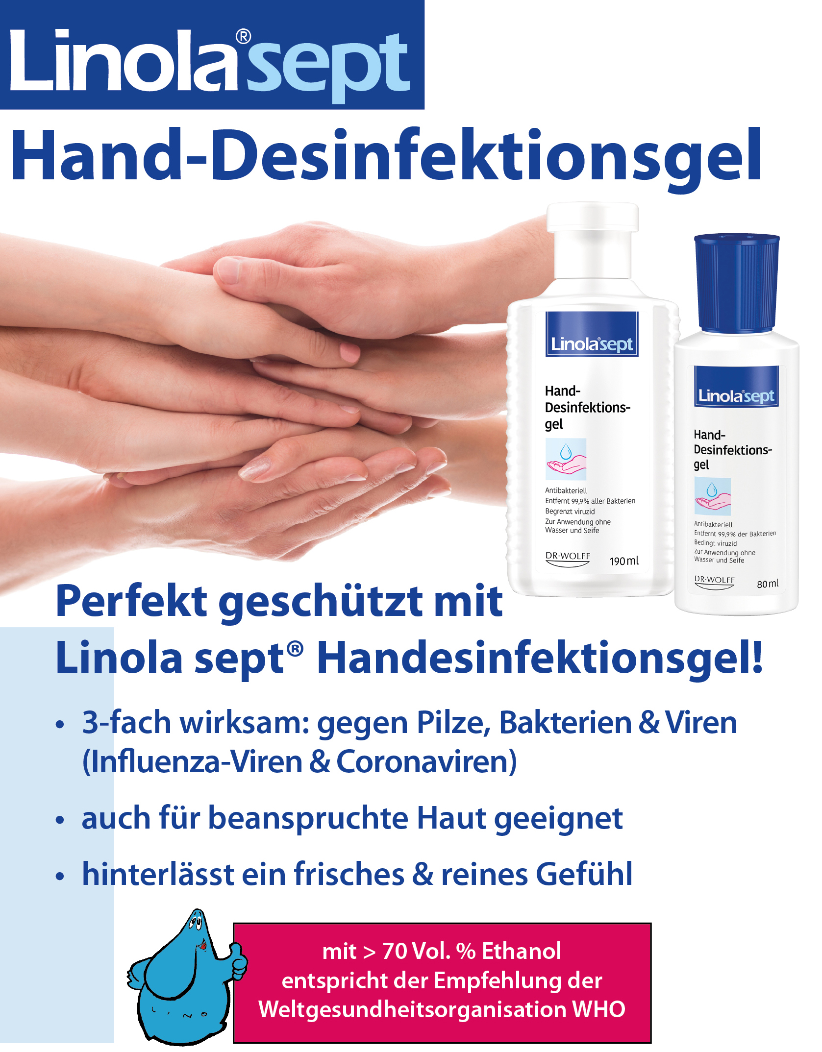 Das Linola® sept Hand-Desinfektionsgel enthält 63 g Ethanol pro 100 g Gel – hierbei handelt es sich um eine Angabe in Massenprozent. Aufgrund der Dichte entspricht dies einem Ethanolanteil von >70 Volumenprozent.