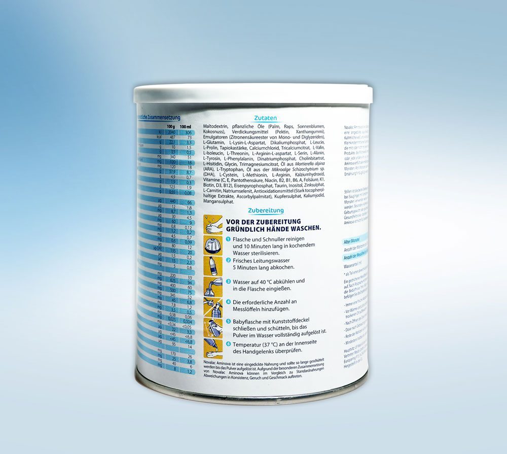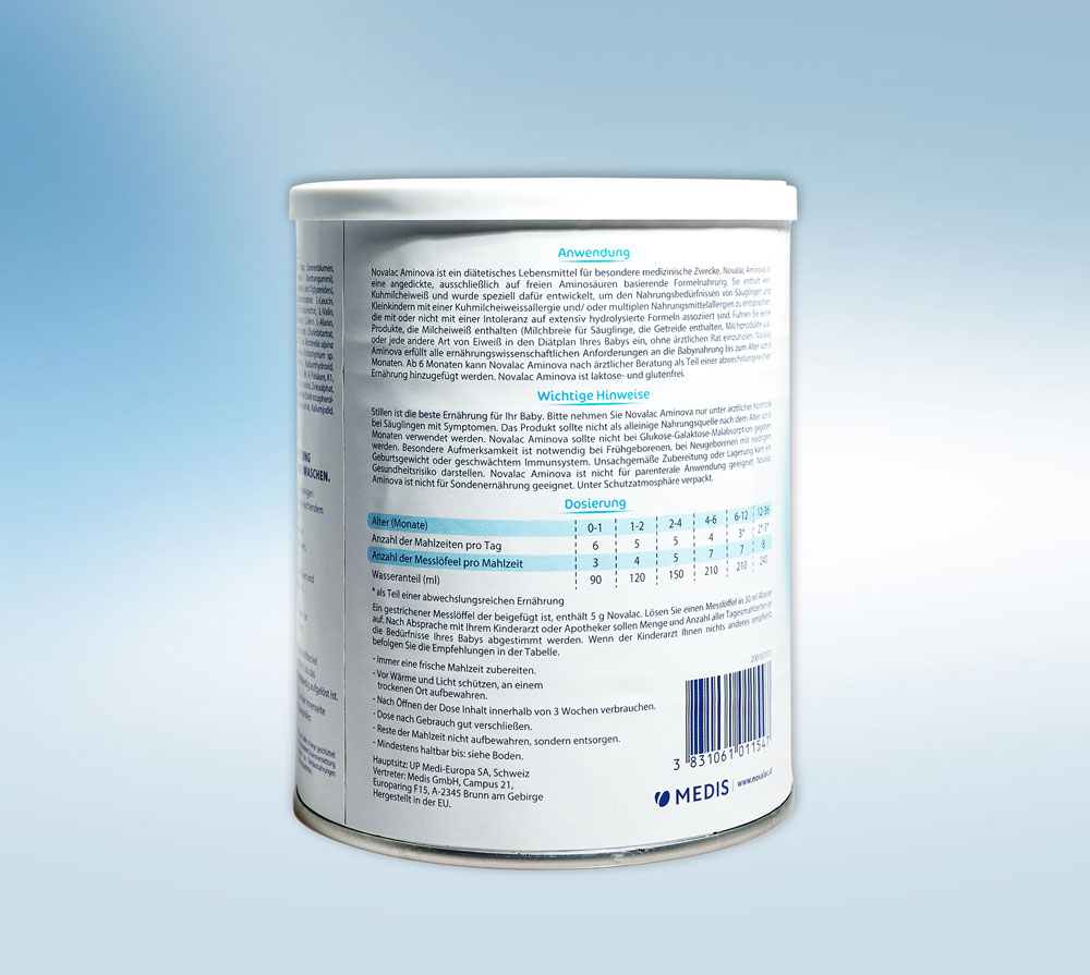 Wichtiger Hinweis: Novalac Aminova wird nur unter ärztlicher Aufsicht verwendet; beraten Sie sich vor der Verwendung mit Ihrem Kinderarzt. Führen Sie in den Ernährungsplan Ihres Babys keine anderen Milchmahlzeiten ein (Michnahrungsbreie für Babys, Milchprodukte, Babykekse mit Milchbestandteilen) ohne Rücksprache mit dem Arzt. Verwenden Sie Novalac Aminova nicht als Nahrungsmittel für gesunde Säuglinge. Aminova darf nicht bei Galaktosämie oder Malabsorption von Glucose und/oder Galactose verwendet werden.