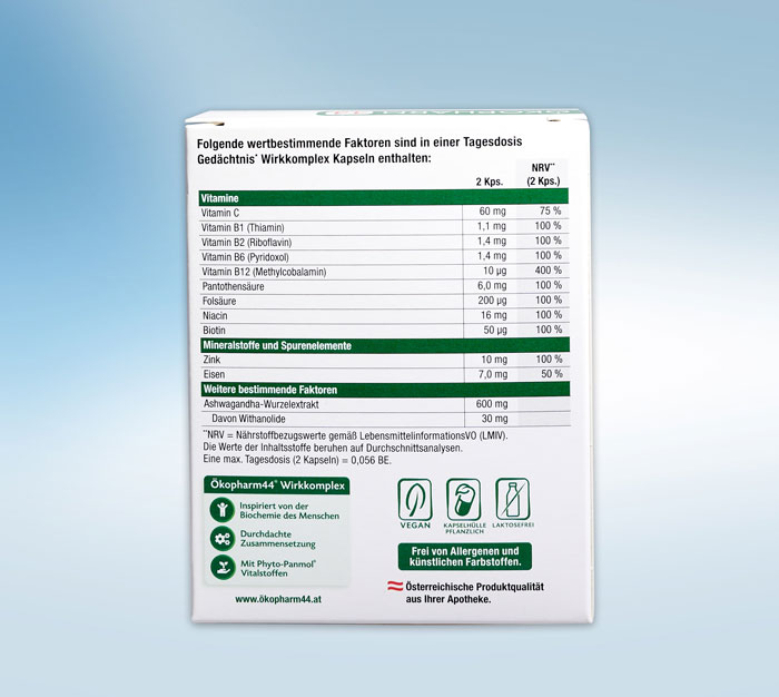 Von unseren Experten durchdacht zusammengesetzte Mikronährstoff-Kombination mit dem Premium Bio-Ashwagandha Wurzelextrakt KSM-66® zur Unterstützung von Gedächtnis und Erinnerung. Das pflanzliche Adaptogen sorgt für Innere Ruhe und unterstützt so die Konzentration. Die Mischung mit allen 8 B-Vitaminen, Zink, Eisen und Phyto-Panmol® Vitamin C aus der Acerolakirsche macht das Produkt besonders.