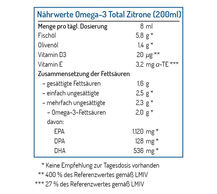 Omega-3 Total ist eine einzigartige Kombination aus einem natürlichen Fischöl mit hohem EPA-Gehalt und einem extra nativen Olivenöl aus biologischem Anbau (Antioxidans). Eine Tagesdosis (8 ml, etwa 1 Esslöffel) liefert 2.000 mg Omega-3-Fettsäuren (EPA und DHA).