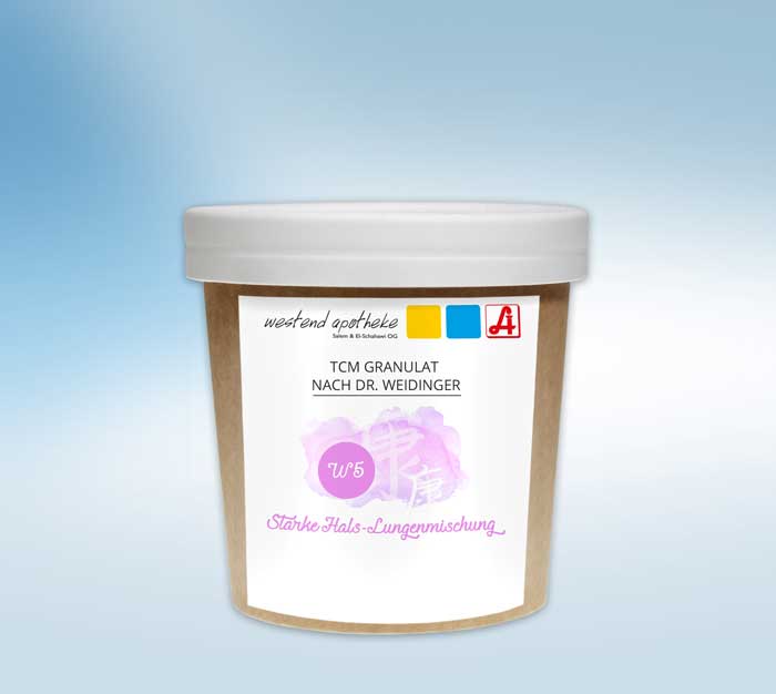 Laut TCM stärkt diese Mischung die Lunge. Sie sollte nicht zu lange eingenommen werden, danach mit einer Milz-Aufbau-Mischung die Mitte für mindestens zwei Wochen stärken (z.B. W8). Auch bei allen „starke Hitze-Zuständen“ im Körper in allen Schichten (bis in die Blut Xue-Schicht). Kann auch für 2-3 Monate zu einer Konstitutionsmischung beigemengt werden (Misch-Verhältnis 2 Teile Konstitution, 1 Teil W5, Einnahme 2-3 x tgl. 3 Gramm).
