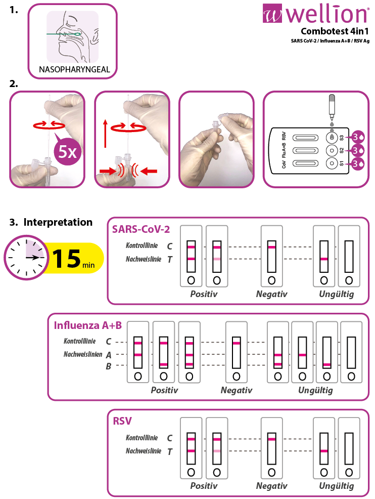 Mit dem Schnelltest von Wellion testen Sie mit einem einzigen Abstrich  auf Covid-19 (Corona), Influenza A und B (Grippe) sowie RSVVirus (Atemwegserkrankung)