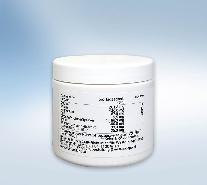 Westend Basen Komplex ist ein hochwertiges Nahrungsergänzungsmittel mit Mineralstoffen, Zink, Silizium und Zitronenfruchtsaftpulver. Es enthält eine ausgewogene Kombination aus Calcium, Magnesium, Kalium, Zink und Bambussprossen-Extrakt, die dazu beitragen kann, den Säure-Basen-Haushalt im Körper ins Gleichgewicht zu bringen – auch begleitend zu einer Mayr-Kur.