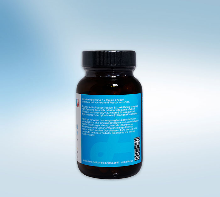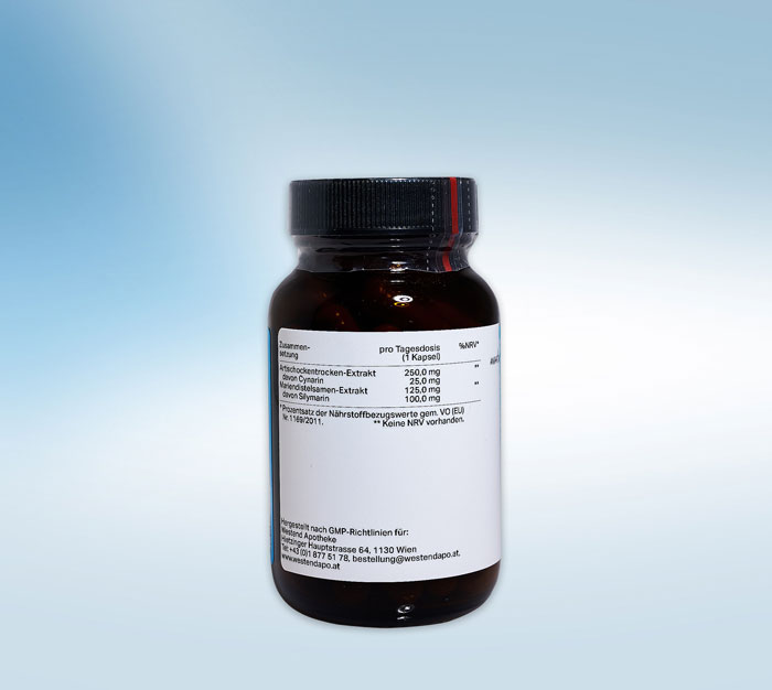 Artischockentrocken-Extrakt (Cynara scolymus; 10% Cynarin), Reismehl, Mariendistelsamen-Extrakt (Silybum marianum; 80% Silymarin), Überzugsmittel: Hydroxypropylmethylcellulose (pflanzliche Kapselhülle).