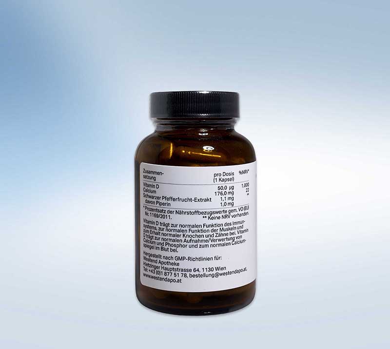 1 Kapsel enthält 2000IE Vitamin D3 = 50mcg Vitamin D3, 176mg Calcium, 1mg Piperin
