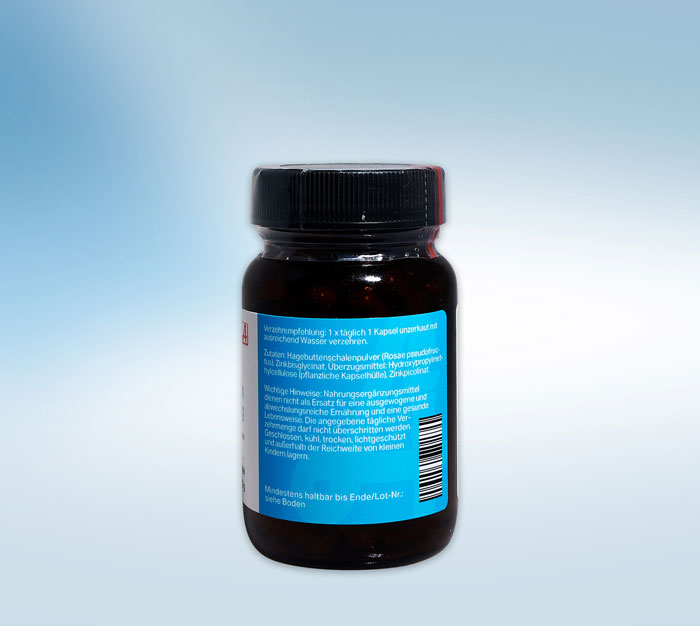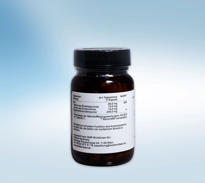 1 Kapsel enthält 30mg Zink, davon Zink aus Zink-Bisglycinat 15mg und Zink aus Zink Picolinat 15mg. Hagebuttenschalenpulver 240mg.